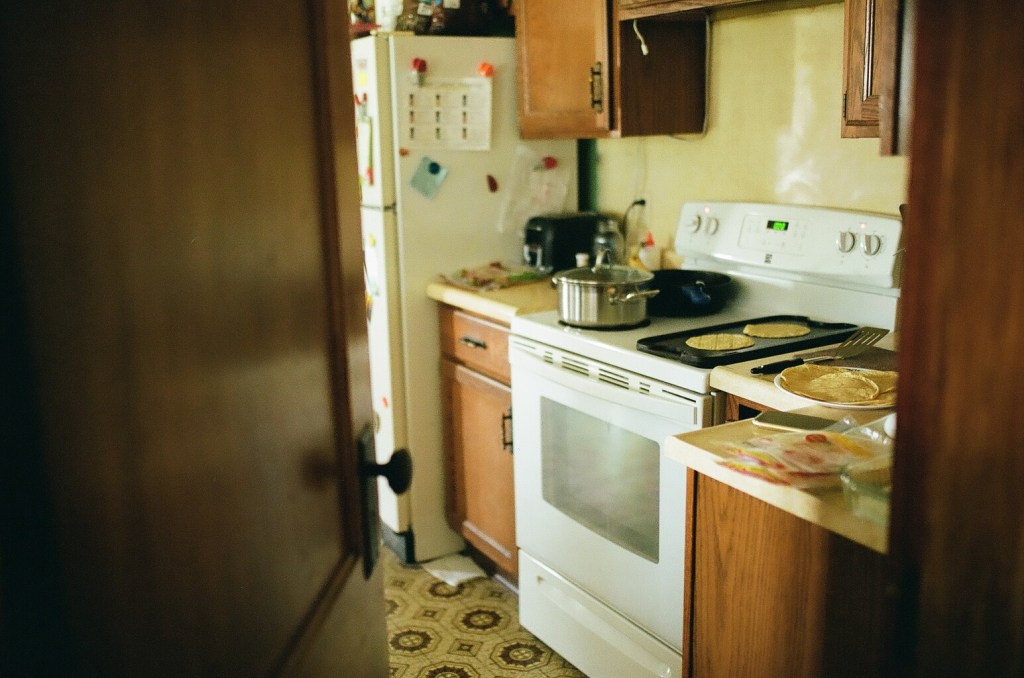 Looking through the kitchen doorway at chicken enchiladas and rice we are making for supper