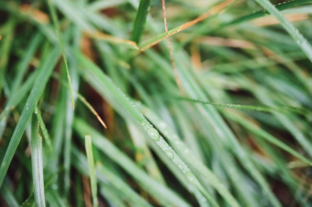 Looking down from above at water drops on some weeds on a rainy day. Not much to say on this dreary day.