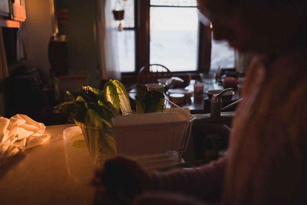 Sunbathing salad freshly washed and drying in the late afternoon light shows a reminder of life, light, growth, health and hope. Even in the dead of the winter this is a welcome reminder of the figurative warmer seasons to come.