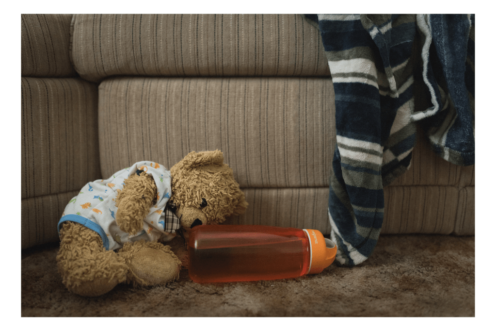 My son’s bear and water next to my blanket